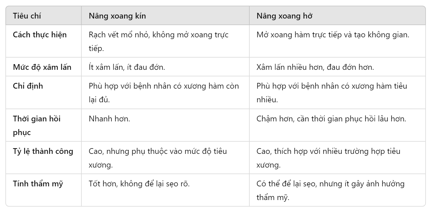 Dưới đây là bảng tổng hợp các điểm khác biệt giữa nâng xoang kín và nâng xoang hở: