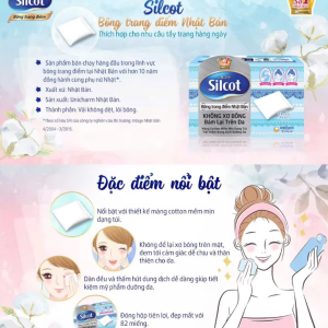 Bông Tẩy Trang Silcot 82 Miếng/Hộp là sản phẩm chăm sóc da bán chạy số 1 tại Nhật Bản trong hơn 10 năm. Được làm từ 100% sợi bông tự nhiên, bông tẩy trang Silcot mềm xốp, êm ái và dịu nhẹ với da. Thiết kế dạng túi thông minh giúp sợi bông thấm đều và tiết kiệm nước dưỡng, không để lại xơ bông trên da, mang lại lớp trang điểm tự nhiên và tẩy trang nhanh chóng.