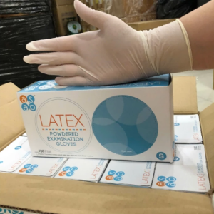 Găng tay y tế cao su: dài 240mm, có bột, cao su tự nhiên.