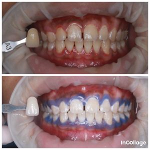 – Bước 2: Bôi 1 lớp mỏng sản phẩm (1mm) lên phần nướu, phần kẽ nướu và răng để che phủ đầy đủ và tạo lớp cách ly nướu khi sử dụng sản phẩm tẩy trắng.