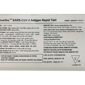Flowflex SARSCoV-2 Antigen Rapid Test, xét nghiệm kháng nguyên SARS-CoV-2 trong mẫu ngoáy dịch mũi hoặc mẫu ngoáy dịch tỵ hầu đã được Bộ Y tế công bố cấp phép. Sản phẩm được sản xuất bởi công ty ACON LABORATORIES – đơn vị có trụ sở chính ở San Diego (Mỹ) sản xuất. ACON LABS nổi tiếng ở hơn 130 quốc gia trong lĩnh vực y tế với 23 năm dẫn đầu trong việc nghiên cứu, sản xuất các dụng cụ chẩn đoán và thiết bị y tế chất lượng cao nên người sử dụng hoàn toàn có thể yên tâm.